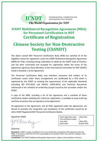 ● 中國無損檢測學會與國際無損檢測委員會(ICNDT MRA)互認的證書原件