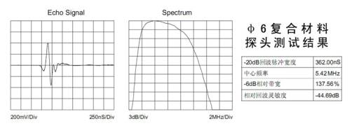 與基于傳統壓電陶瓷的探頭相比,1-3復合材料晶片探頭性能提升相當的明顯,具有靈敏度高、帶寬大、指向性好等特點,Kt達到了68%,對于相控陣探頭還能有效減小串擾。在工業領域,因為它的高帶寬特性,在粗晶材料的檢測和高精度測厚具有明顯的優勢,舉個例子說明一下:以奧氏體不銹鋼焊縫檢測為例,因為材料的聲衰減比普通鋼鐵大很多,探頭靈敏度的提高將帶來探傷余量的增加,更重要的是帶寬的提高增強了對低頻信號的檢測能力,因此能夠檢測到頻散后的低頻信號,從而檢測到缺陷。我們用復合材料制作的5MHz雙晶測厚探頭在靈敏度比普通壓電材料制作的探頭高3dB的前提下,-6dB帶寬還能夠達到134%,回波峰峰值-20dB時域脈沖寬度僅有360nS,從而達到高精度測厚的要求。另外其生產工藝也比傳統探頭更為先進,質量更有保障。