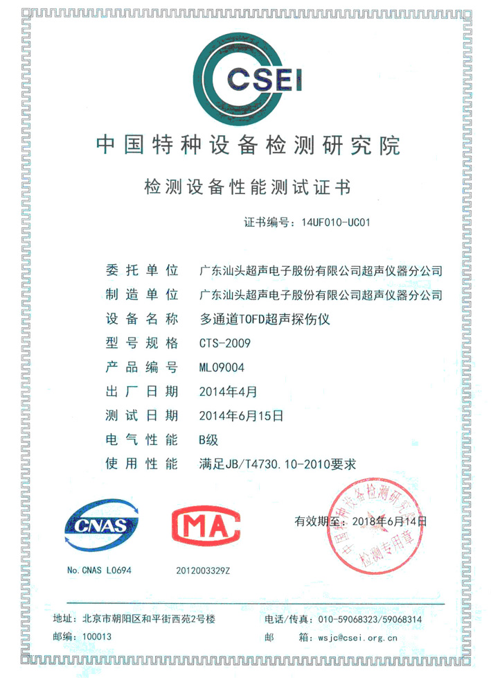 近日,廣東汕頭超聲電子股份有限公司超聲儀器分公司研制的多通道TOFD超聲探傷儀CTS-2009一次性通過中國特種設備檢測研究院的檢測并獲得B級證書,這是廣東省唯一一家TOFD超聲探傷儀器能夠完全、不帶限定條件達到中國特檢院B級產品檢測和取得證書的企業。中國特檢院根據GB/T 27664.1-2011、EN 12668-1:2010、JB/T 4730.10-2010、JB/T 10061-1999 A、JB/T 9214-2010、JB/T 8428-2006、CSEI/QM-3-C114等多項標準要求對CTS-2009儀器的電氣性能、功能和使用性能等進行系統測試,其中儀器的電氣性能綜合評價為B級(不帶限定條件,限定條件是儀器在一定條件下達不到B級要求),達到國外同類先進儀器指標要求;在類似等效輸入噪聲、凈增益等14個TOFD檢測關鍵指標中達到A類性能指標要求。