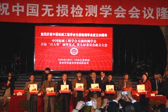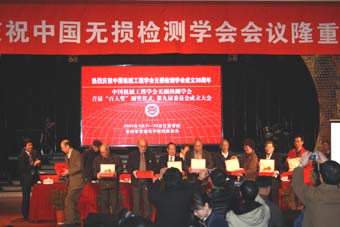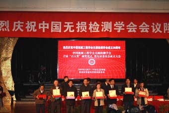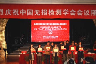 中國機械工程學會無損檢測分會成立30周年來,許多工作者對無損檢測做出了卓越的貢獻。特此會議設立了首屆“百人獎”,對108位無損檢測人員進行了表彰。獎項共分三項,杰出貢獻獎,包括應崇福、馬銘剛、李家偉、姚錦鐘、王務同、陳積懋、郭成彬、蔣危平8位;特殊貢獻獎包括耿榮生、沈建中、鄭世才等共40位;優秀學會工作者獎包括丁克勤、馬劍民、劉時風等60位。學會副主任委員沈功田博士宣讀了獲獎人員名單,中國機械工程學會副秘書長王瑞剛和學會正副主任委員為30年來對學會作出積極貢獻的無損檢測人員頒發獎狀和獎金。獲獎人員一一上臺領獎并合影,氣氛熱烈又歡快。
